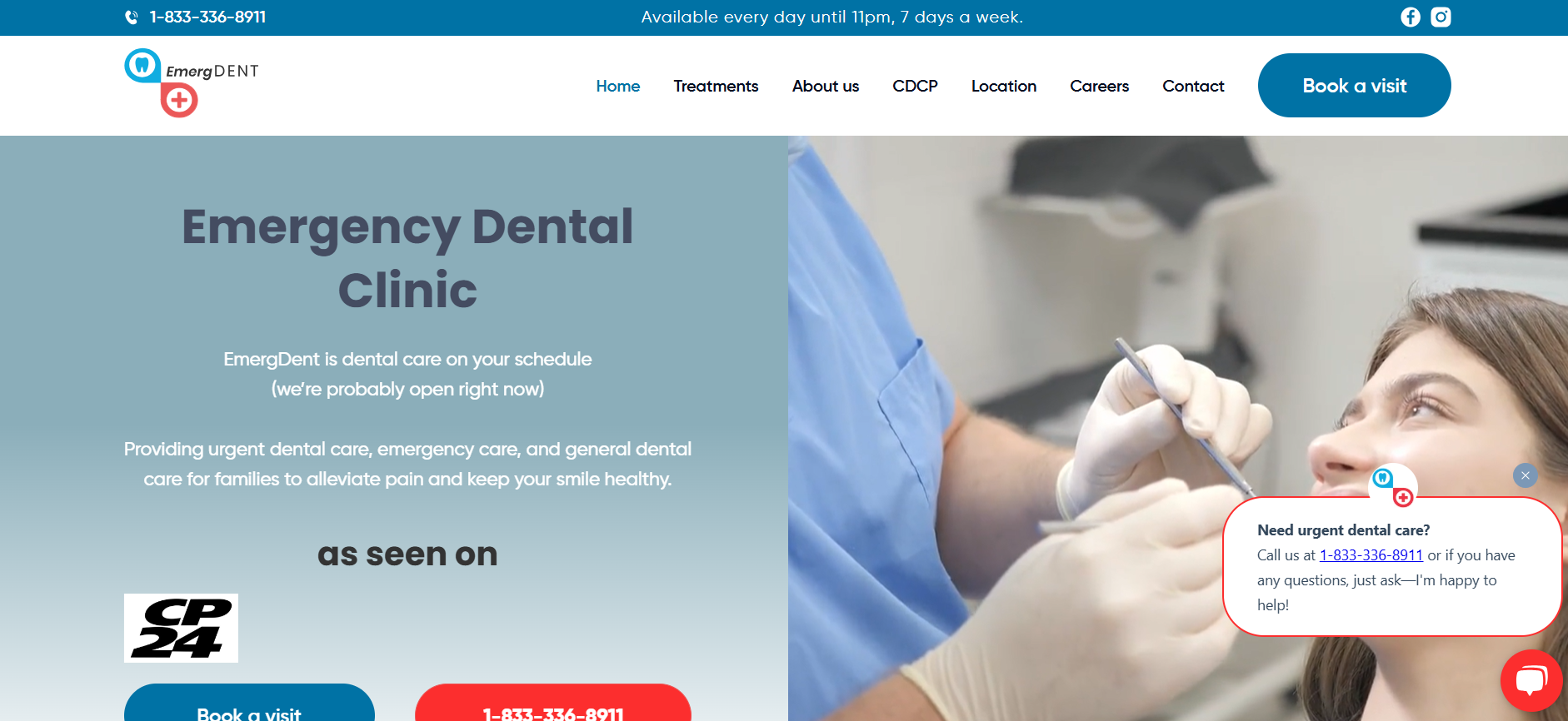 EmergDENT is a leading emergency dental clinic serving Toronto and the Greater Toronto Area (GTA), open daily until 11 PM, including weekends and holidays, ensuring you have access to care beyond typical office hours.